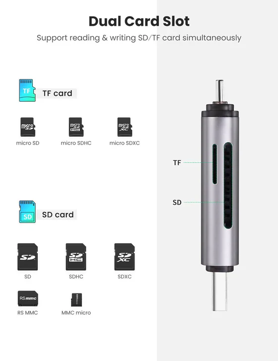 Both card slots can be used simultaneously especially when connected to a PC/laptop, you will receive more efficient data transfer and no longer waste long time to wait. The USB 3.0 USB C to SD Adapter supports all popular memory cards including SD, SDHC, SDXC, RS-MMC, MMC, Micro SD, Micro SDHC, Micro SDXC and UHS-I cards in large capacity up to 512G.????
