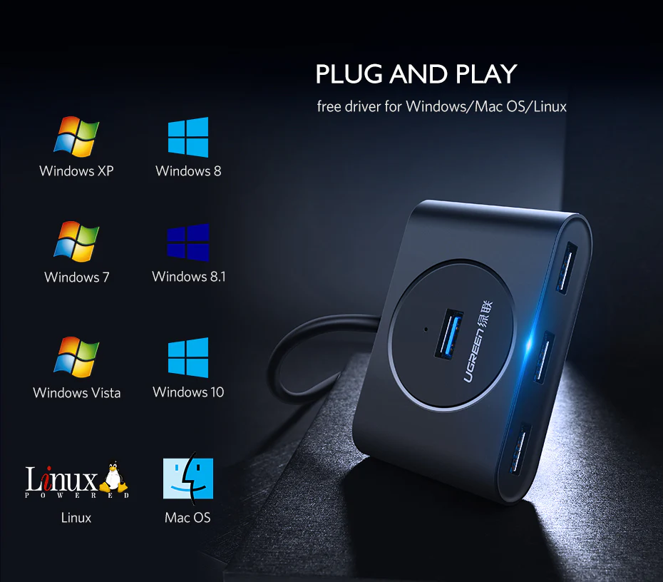 - Expand USB Ports on your PC or UltrabookUgreen 4 Port USB 3.0 Hub helps you to connect up to 4 USB devices to your PC or Laptop, such as external hard drives,USB flash drives,mouse,keyboard,and much more USB devices etc.It keeps you away from the trouble of plugging&unplugging repeatly.SuperSpeed DataTransferUSB 3.0 Hub supports super faster data transfer up to 5Gbps- 10X faster than USB 2.0 (480 Mbps), which allows you to transfer HD movies or files in just seconds.Stable and Secure ConnectionWith built-in protection for over-voltage and over-current, this USB 3.0 hub can keeps your digital devices and data safe.LED IndicatorsThrough the LED indicator,you can easily monitor the connection statusUSB 3.0 Cable flexibleYou can extend the hard-to-reach USB ports on your desktop to your desired location,which making it a nice choice for desktopHandy and CompactThe handy and compact design offers an ideal way to fast access to your USB devices anywhere